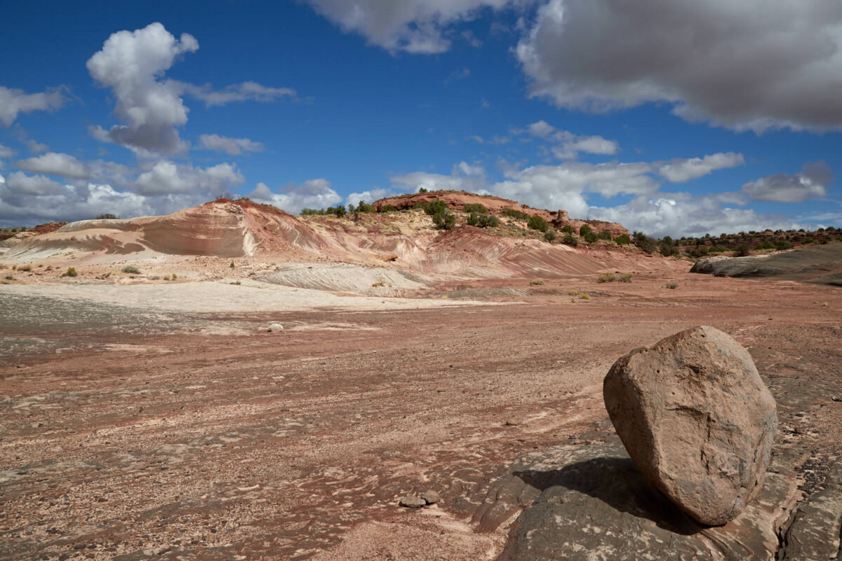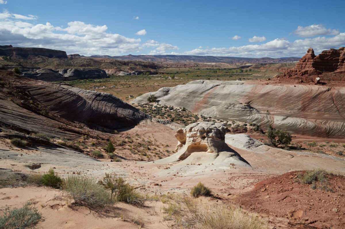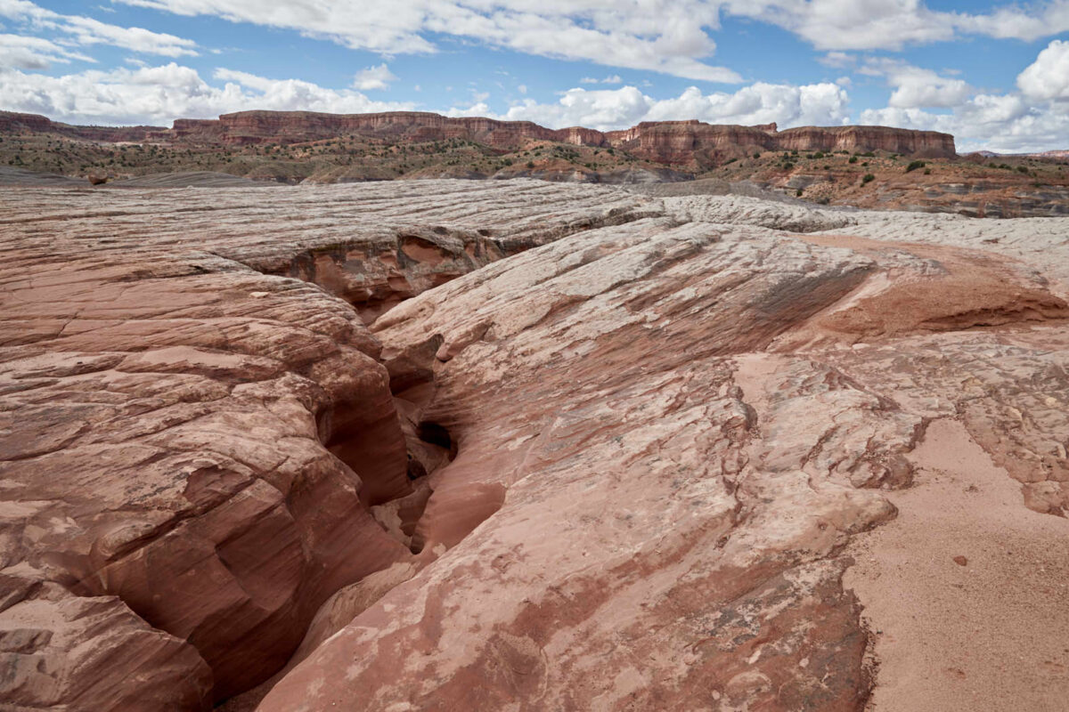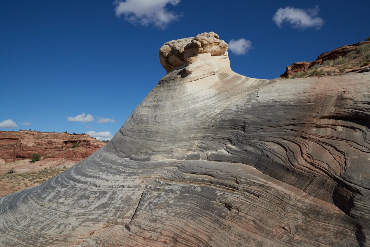 Oben angekommen läuft man immer entlang des Felsens in westlicher Richtung wieder zurück in Richtung White House Road. Man erreicht ein Steinplateau. Auf diesem läuft man jetzt ein paar 100m in südlicher Richtung bis man vor Calypso (links) steht. Diese Steinformation erinnert sehr stark an den Nautilus und weil wir im Netz nirgendwo Informationen dazu gefunden haben, haben wir der Formation den Namen Calypso (nach dem Forschungsschiff von Jacques-Yves Cousteau) gegeben. Neben Calypso gibt es auf der Ebene aber noch einiges mehr zu entdecken. Gegenüber, direkt an der Felskante, findet man noch einen tollen schneeweißen Alkoven. Der Abstieg ist hier auch sehr steil, aber wegen dem griffigen Sandstein ganz gut zu bewältigen. Ein weiteres Feature findet man ein wenig östlich von Calypso. Hier gibt es noch ein paar nette Steinsäulen und Hoodoos aus rotem Sandstein. Wir haben Calypso und die Umgebung im Oktober 2018 besucht.