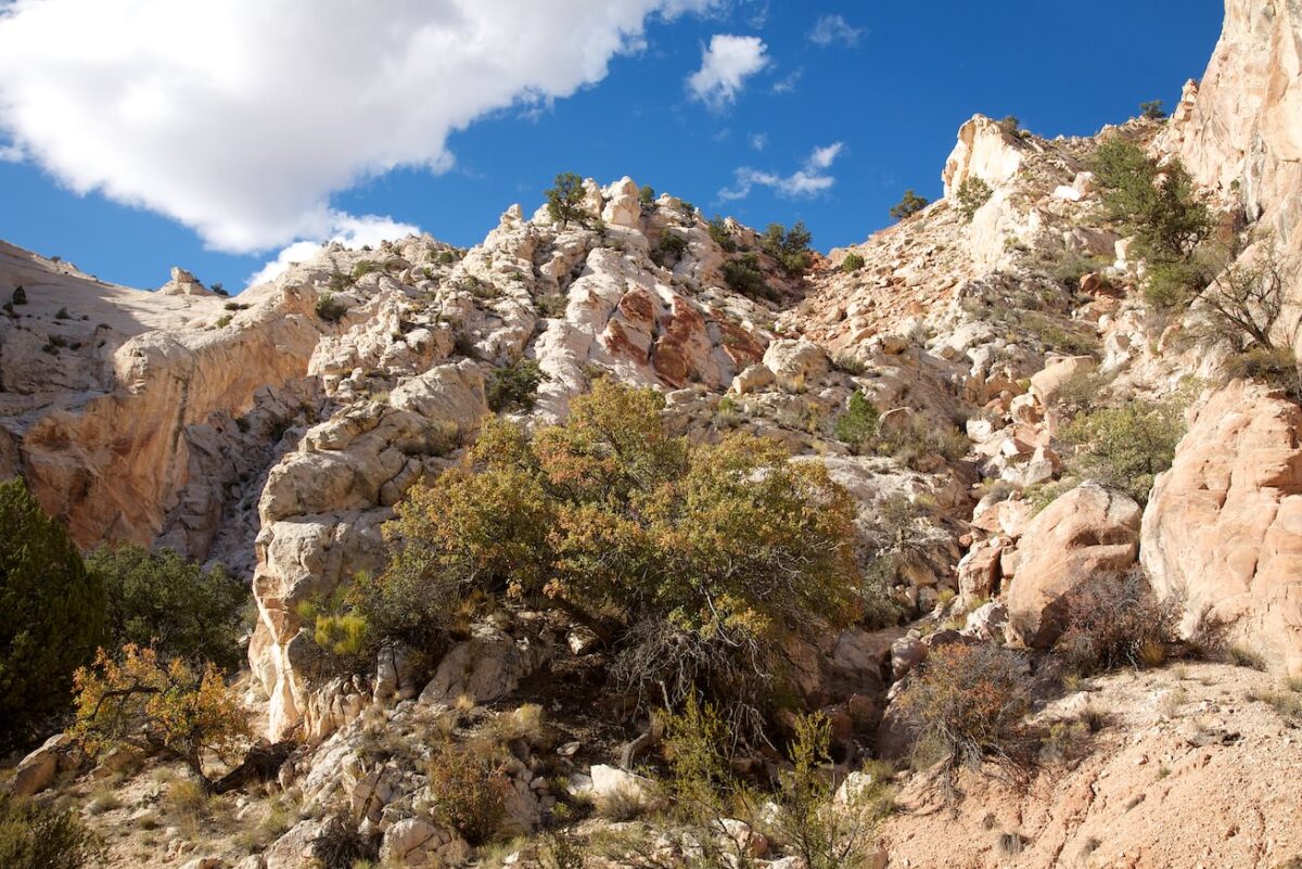 Die Wanderung im Detail: Die Wanderung ist, bis auf eine Ausnahme, an und für sich nicht besonders schwierig. Es gibt keine wirklichen Wege. Ein Großteil des Weges führt über Sandstein. Zunächst sucht man sich einen Weg durch und über den Cottonwood Creek gegenüber des Trailheads. Sollte der Fluss Wasser führen, ist das eine sehr matschige Angelegenheit. Nach dem Überqueren des Creeks kommt die einzige knifflige Stelle des Weges, denn nun muss man einen etwa 100 Höhenmeter hohen, sehr gerölligen Abhang hinaufklettern. Es ist sehr steil und rutschig. Hier ist ein wenig Mut und vor allem Trittsicherheit vonnöten. Das Stück ist aber nicht sehr weit und wenn man es geschafft hat, ist der restliche Weg kein Problem mehr. Oben angekommen, kommt auch schon sehr bald der Yellow Rock ins Blickfeld und von hier aus kann man ganz frei das ganze Gebiet erkunden.