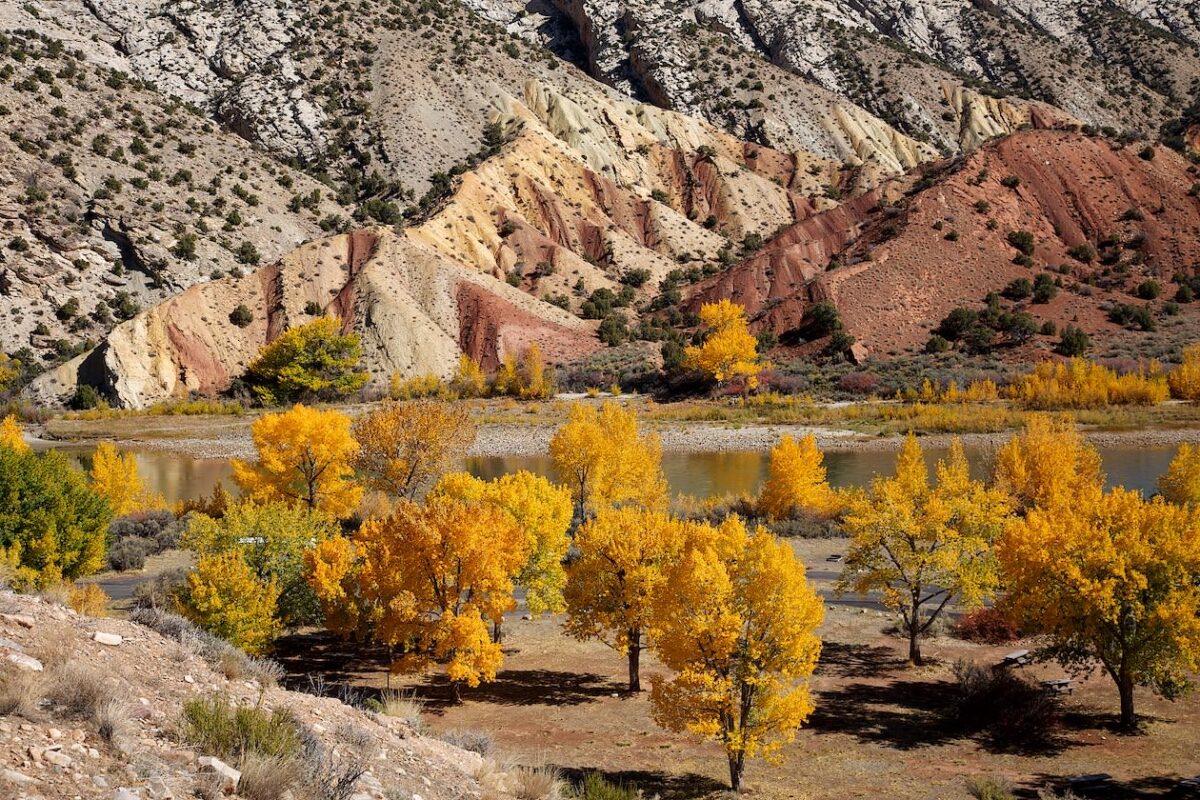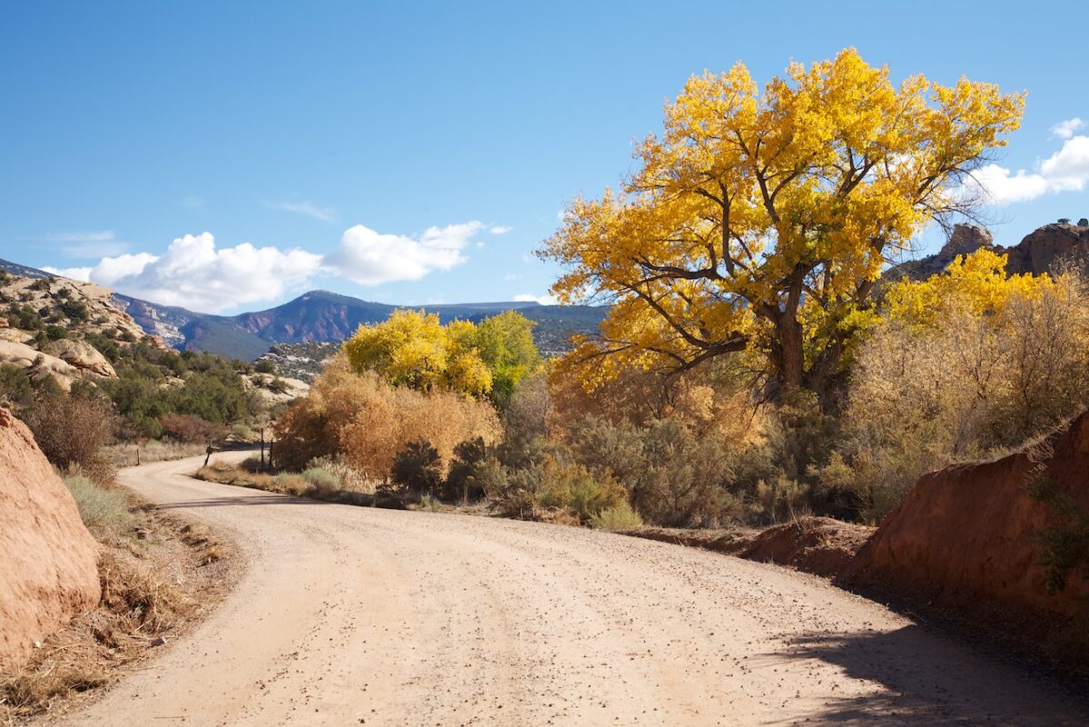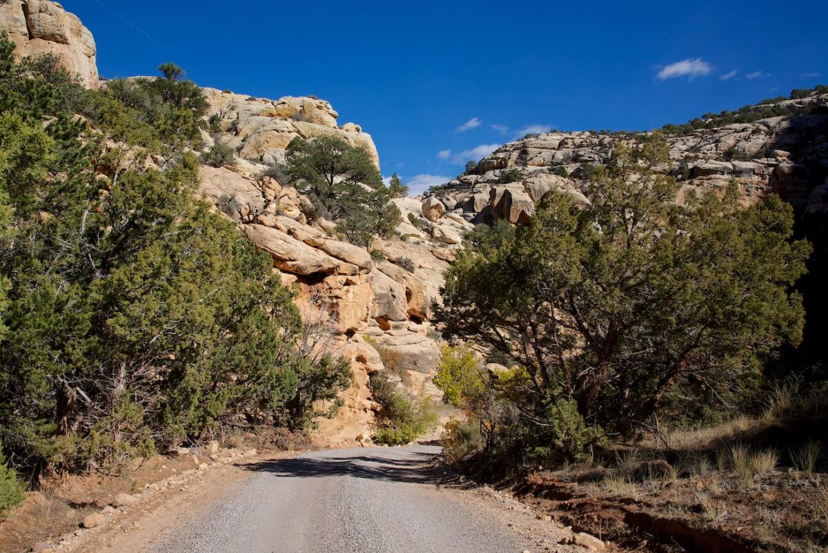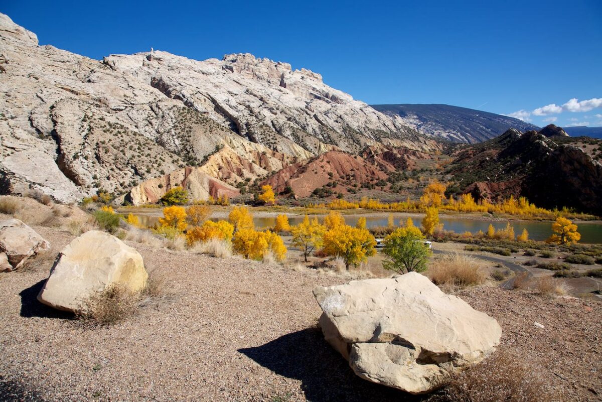 Beschreibung: Die Cub Creek Road ist die Parkstraße im Fossil Bone Quarry Teil des Dinosaur NM. Sie führt an allen Sehenswürdigkeiten in diesem Parkteil vorbei und bietet tolle Aussichten auf interessante Felsformationen und bunte Bäume.