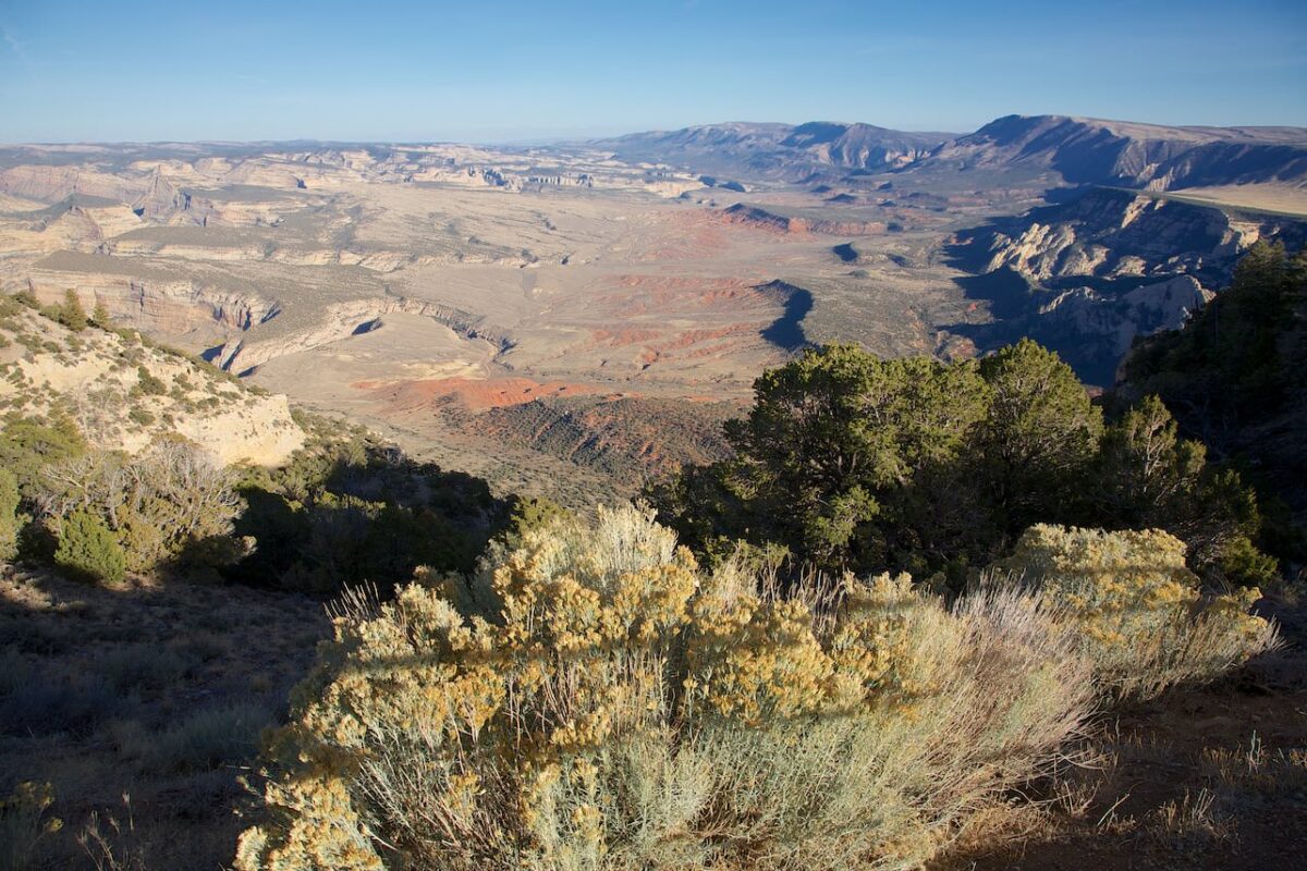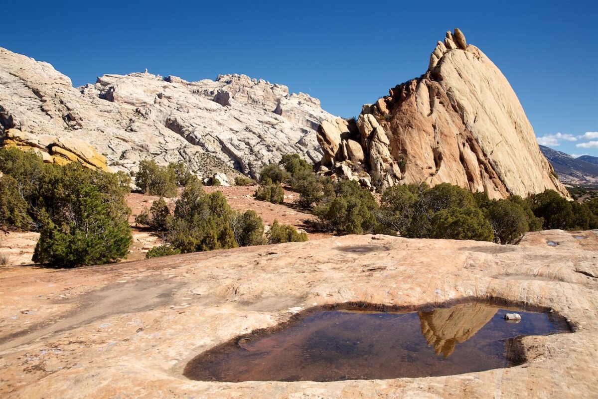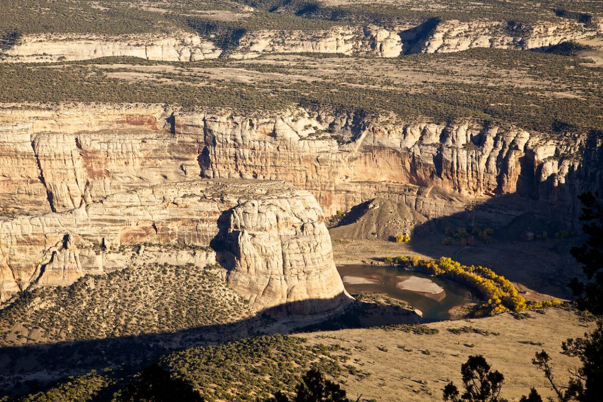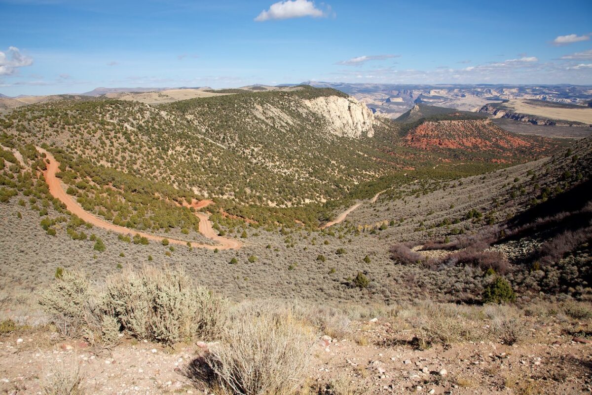 Beschreibung: Nach 40km auf der Harpers Corner Road biegt man rechts auf die Dirt Road in Richtung Echo Park ab. Die folgenden 20.8km bis zum Steamboat Rock sind ungeteert und die Straße ist nur bei gutem Wetter befahrbar. Hohe Bodenfreiheit ist hier immer von Vorteil. Der Echo Park bietet neben tollen Landschaften auch Petroglyphen und einen Blick auf die frühe Siedlungsgeschichte dieser Gegend. Hat man den Steamboat Rock erreicht hat man einen wunderbaren Blick auf den Green River, der sich hier in einem großen Bogen um den Felsen windet.