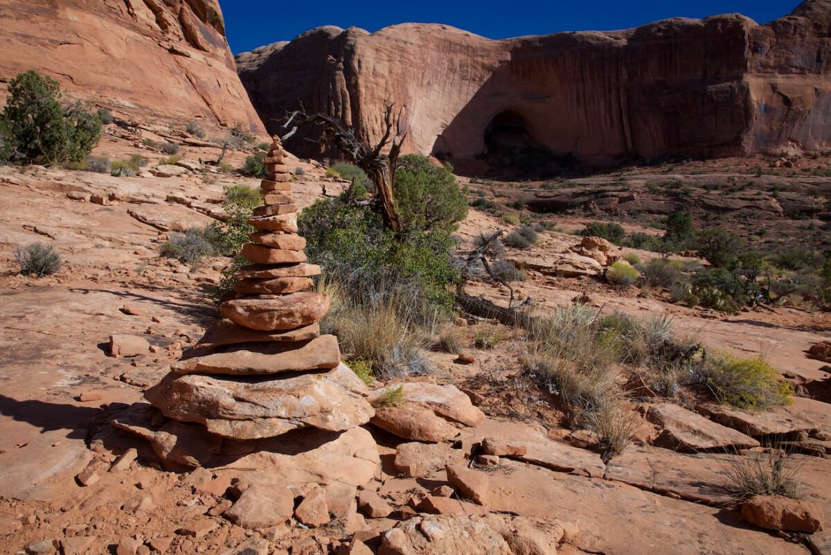 Beschreibung der Wanderung: Die Wanderung ist eigentlich recht einfach. Zuerst muss man den steilen Bahndamm nach oben und die Gleise überqueren. Danach geht es dann aber nur noch moderat bergauf. Der Weg ist mit Steinmännchen markiert, aber trotzdem solle man ihnen nicht immer blind folgen. Nach ein paar hundert Metern kommt der Pinto Arch in Sicht. Etwa nach der Hälfte der Strecke kann man dann auch den Corona Arch sehen. Ab hier kann man sich dann auch sehr leicht orientieren. Etwa 500m vor dem Ziel muss man einen steilen Felsen und eine Leiter nach oben klettern. Am Felsen sind Tritte eingelassen und es befindet sich ein Seil zum Festhalten an der Seite. Hier könnte für höhenängstliche Menschen vielleicht ein kleines Problem sein. Danach geht es in einem großen Bogen, relativ eben auf den Arch zu.
