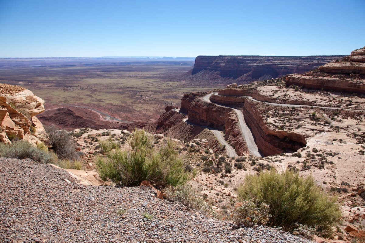 Description: The Moki Dugway is an unpaved section of Highway 261 that climbs 1099ft at a gradient of 11% over 3mi. From the top you have breathtaking views of the surrounding landscape and the Valley of the Gods. Since 2016 the Moki Dugway is part of the Bears Ears NM. Built in 1950 to transport mineral resources from Cedar Mesa to the plains at Mexican Hat. The road is mostly in very good condition and so can be driven by any passenger car.