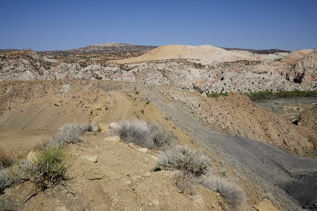 Description: The Jeep Road turns east from Cottonwood Canyon Road at the Yellow Rock parking lot and leads up to Bigham Plains, down into Coyote Canyon, and back to the Cottonwood Canyon Road. When we visited in April 2022, the dirt road was in good condition; however, it is very steep and so the road may not be suitable for every car traveling on CCR. Turning around is hardly possible on the narrow road so that you have to roll backwards in case of an emergency. We drove down the road only as far as a hilltop from which there was a great view of Yellow Rock.