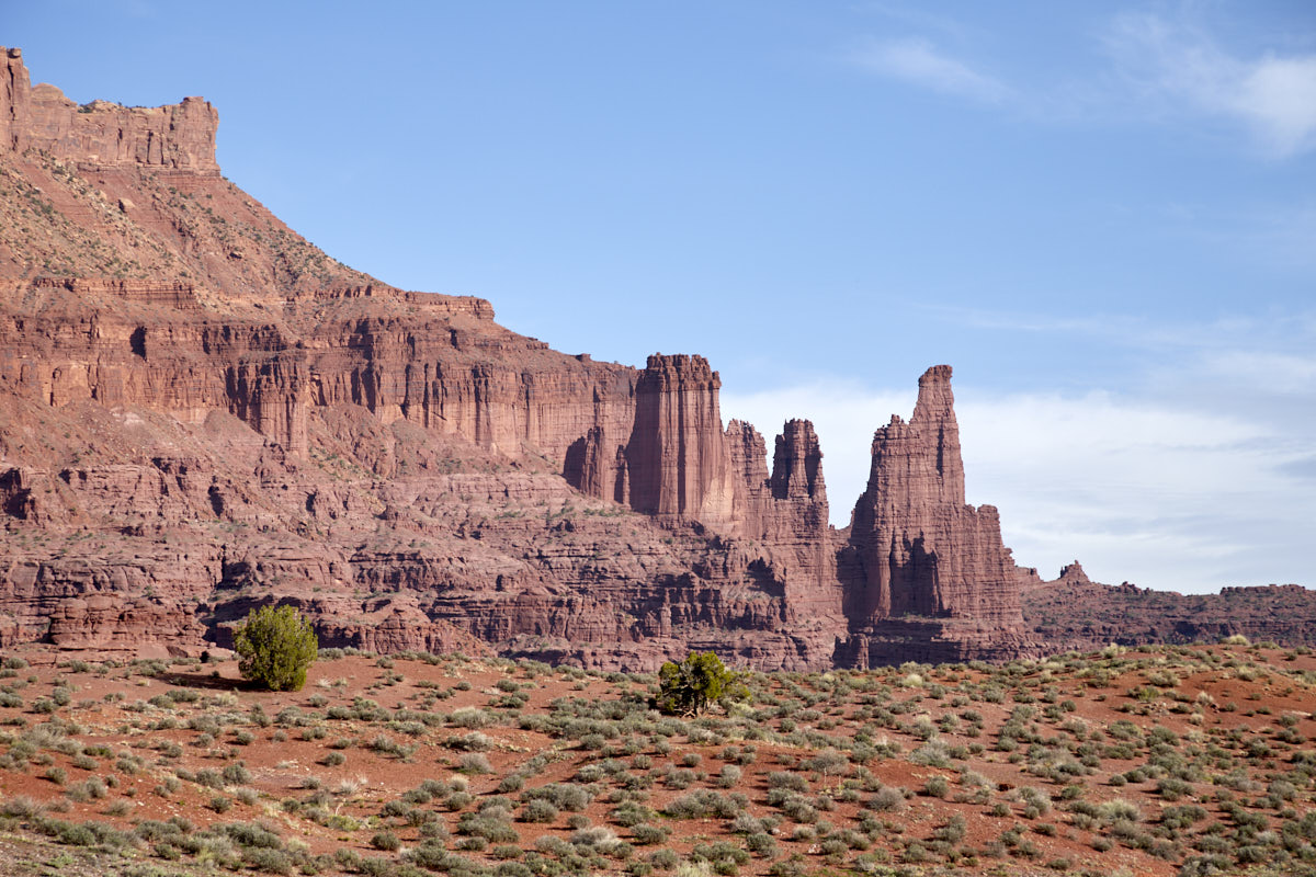 Description: The Fisher Towers are a prominent sandstone formation east of Moab. They were named in 1880 after a settler who lived nearby. Today they serve mainly as a popular hiking and climbing area. They can be reached via a short dirt road, which is usually in very good condition and can be driven on with any car.